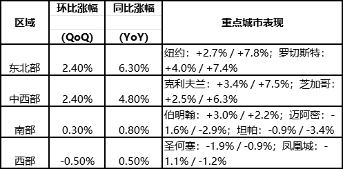 • 东北部和中西部市场继续领跑,多地涨幅稳健;南部和西部部分城市开始承压甚至下跌。
