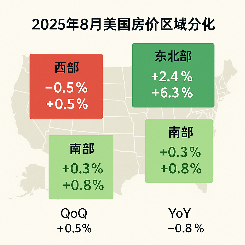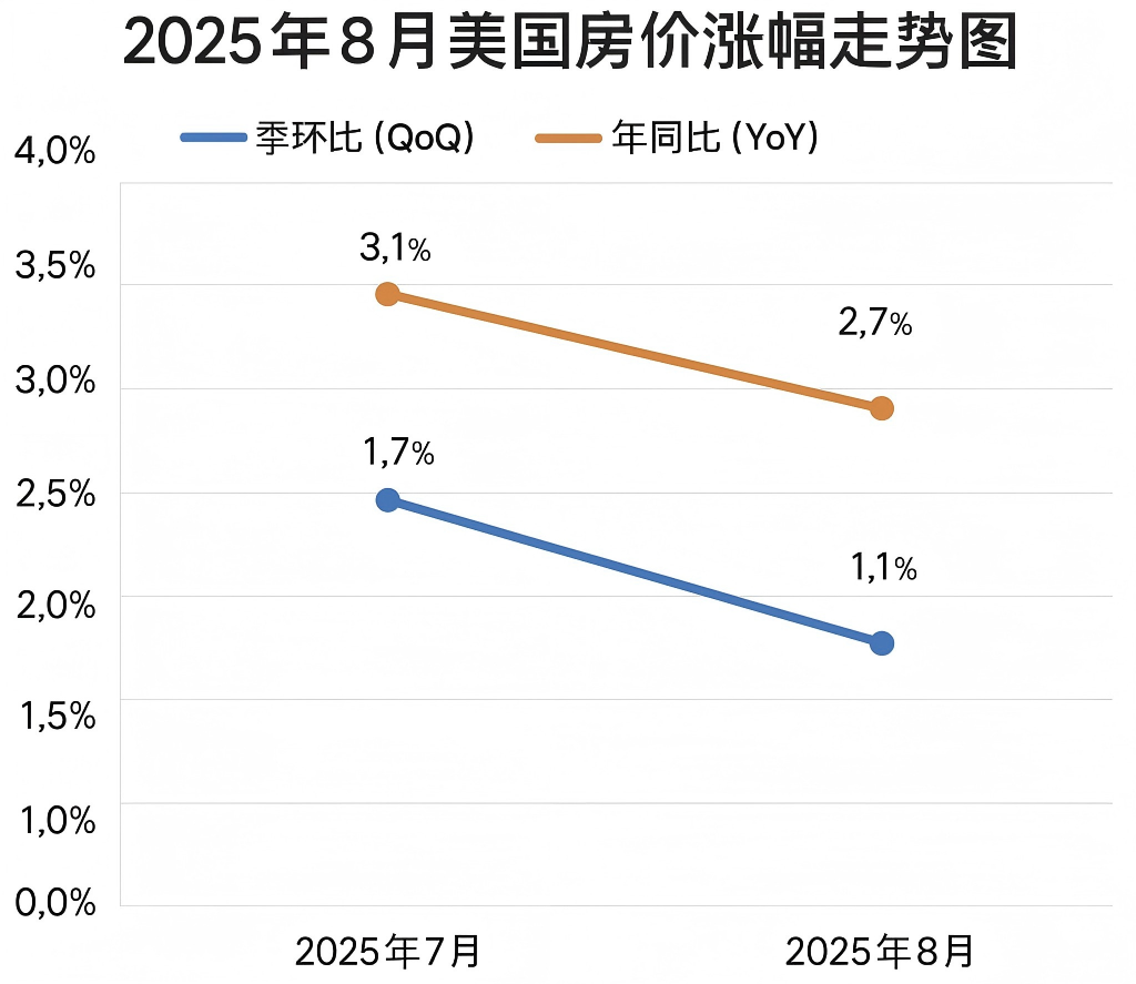 • 全国季环比涨幅为 +1.1%,年同比涨幅为 +2.7%,均低于 7 月水平(+1.7%、+3.1%),显示涨势正在放缓。