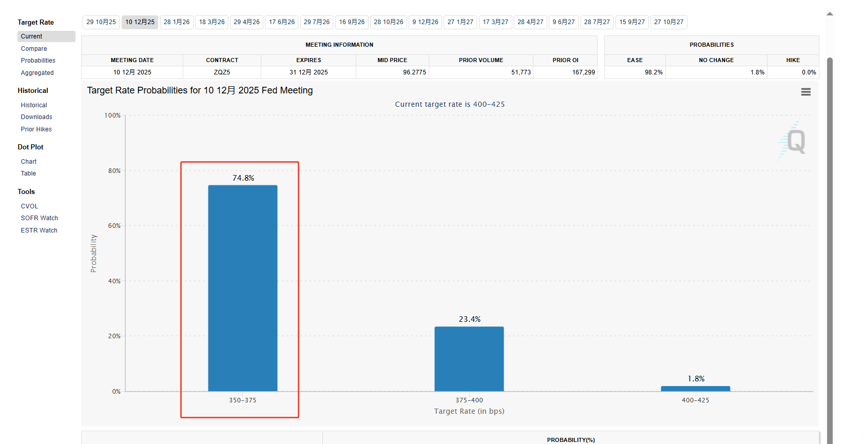 就在刚刚,本周的初请失业金人数公布,略低于预期,也就是说新增失业人口比预期的低,就业略向好,市场利率一下子又涨了上去。这个数据在平时其实重要性并不算太大,因为每周都会公布,长期的连起来看才可能看出点趋势,但这次市场利率对这个数据的敏感性却比较高,说明在FOMC之后,市场投资者再一次陷入了迷茫,过于符合预期的FOMC,让市场不知道下一步该怎么办了。我们可以看下图,CME FED watch tool对于年底前再降息两次的预期概率,74.8%,和会议之前的概率几乎持平,也就是说FOMC会议并未改变市场对接下来美联储降息路径的预期。