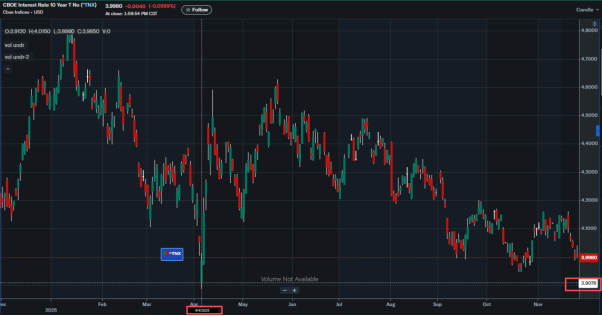 这个点位很关键,因为在4月份的关税乱局时,市场利率先大幅下跌,又大幅上涨,当时就在3.9%-4%这个区间形成了非常强的支撑位,想继续向下突破这个支撑位,需要更大的理由,更强的动力,让投资者愿意花重金去投资国债。所以在那时,到达强支撑位后,市场利率开始有所反弹。
